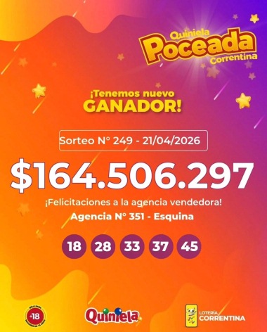 En el sorteo realizado en la noche del martes, un apostador de la localidad correntina de Esquina se convirtió en millonario tras acertar los cinco números de la Quiniela Poceada y llevarse un premio de $164.506.297.