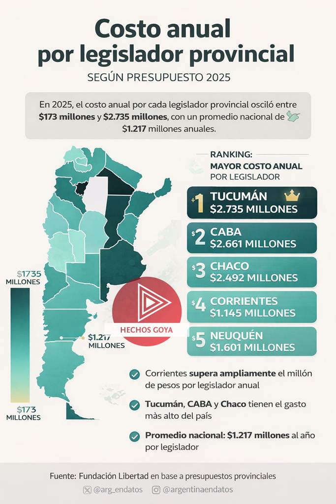 En 2025, el costo anual por legislador provincial en la Argentina mostró fuertes disparidades entre distritos. Según un informe elaborado por la Fundación Libertad, en base a los presupuestos provinciales, el gasto por cada legislador osciló entre $173 millones y $2.735 millones anuales.