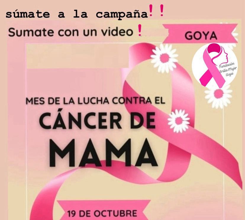 Súmate a la Campaña: “Movida Rosa”. La Fundación Brilla Mujer Goya ayuda a pacientes oncológicos, te invita a sumarte a la “Movida Rosa”, es simple se envía un video con mensajes, saludos, felicitaciones, baile, carteles para ser subido a las redes de la Fundación.