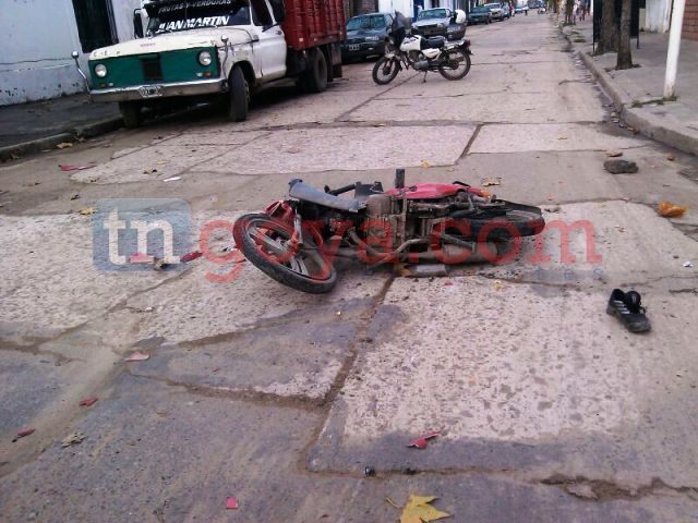 En el medio día del viernes una persona que fuera luego identificado como de apellido Barboza (a) BOCONA en circunstancias que aun se investigan, protagonizo un accidente de tránsito en las calles 25 de Mayo esquina Corrientes luego que este viera el patrullero en las intersecciones de Mitre y 25 de Mayo, huye de contramano a bordo de una motocicleta GUERRERO trip de color rojo sin dominio y colisiona con otro motociclista en la dirección antes mencionada dejando además del rodado sus zapatillas en el lugar.(IMÁGENES)