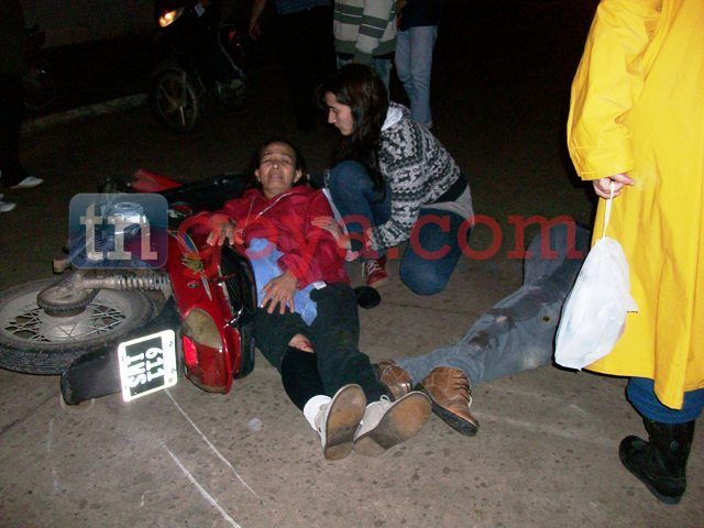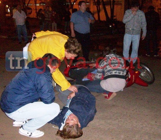 El sábado cerca de las 19 horas en las calles Pago largo y salta dos mujeres qué se desplazaban a bordo de una motocicleta roja dominio 611 IWS quien conducía en esa oportunidad Luisa Verón impactan contra un automóvil Renault 19 de color rojo chapa patente BRU 306 quien se prestaba a girar por salta. Las motociclistas según relatos de testigos al equipo de TNGOYA.COM en lugar, estas venían dialogando entre si y por no prestar la atención debida de que el automóvil se disponía a girar estas lo chocan, como resultado del impacto ambas sufrieron traumatismo varios. (IMÁGENES EXCLUSIVAS)