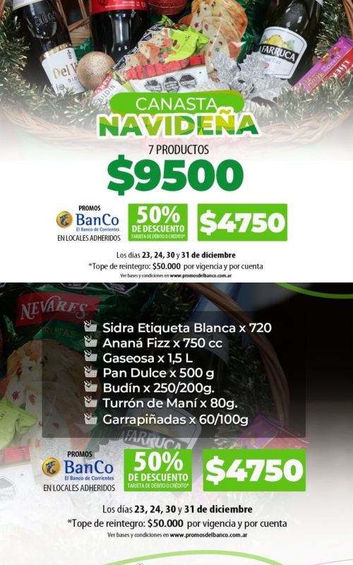 El precio de la Canasta Navideña es de $9.500 en los comercios adheridos, y este valor cae hasta $4.740 comprando con las tarjetas del Banco de Corrientes, en los días de la promoción. Está conformada por siete productos de primera calidad y la vigencia es durante este mes de diciembre.