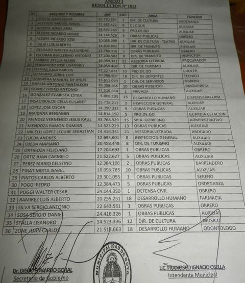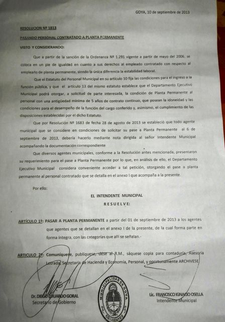 En las últimas horas se dio a conocer un listado de personas que pasaron a planta permanente en el municipio de Goya, que por resolución Nº 1813 y firmada por el Intendente Osella, gozan de e4stabilidad laboral desde el dia 1 de septiembre. Esto causo malestar y rechazo en municipales, donde en dicho listado figuran funcionarios de alto rango, punteros políticos y ex vecinalistas. Desde el concejo deliberante adelantaron, revisaran cada uno de los pases a planta permanente. A continuación la resolución y listado.