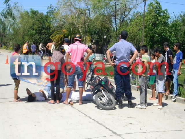 El siniestro vial ocurrió en Viamonte a metros con la intersección de Brasil, dos jóvenes a bordo de una motocicleta Motomel 110 c/c embisten de lleno una valla, pierden el control del rodado y terminan tirado en el pavimento con golpes varios. Los heridos fueron trasladados en ambulancia al Hospital Regional. IMAGENES DEL SINIESTRO
