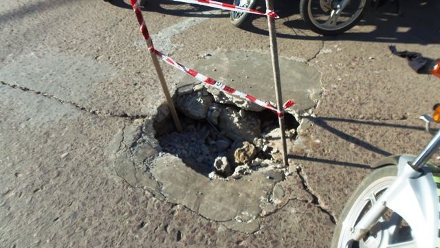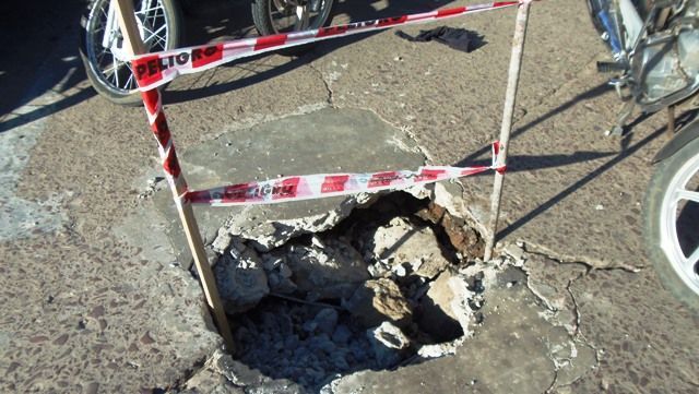 Se hundió el pavimento en pleno centro quedando atascado la rueda de un vehiculo