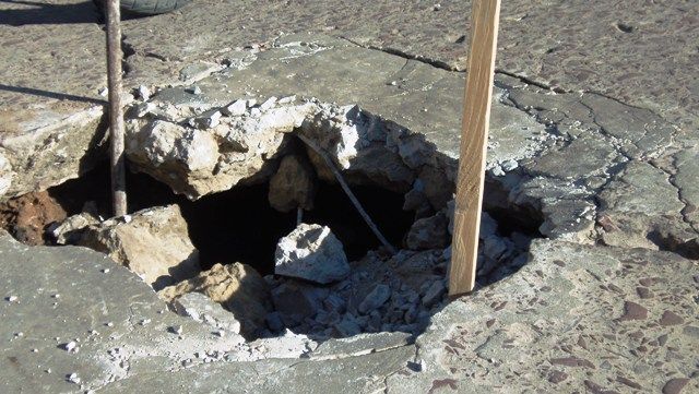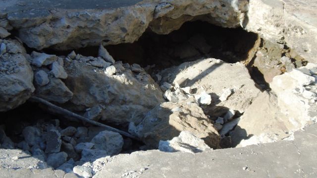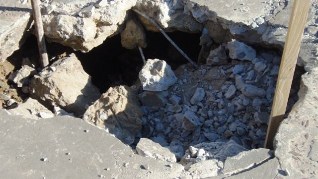 Como se puede apreciar en la foto el espesor de la capa de cemento no era muy grueso, lo que se presume no aguanto el peso del vehículo, y además se rajo todo el ancho de la calle.