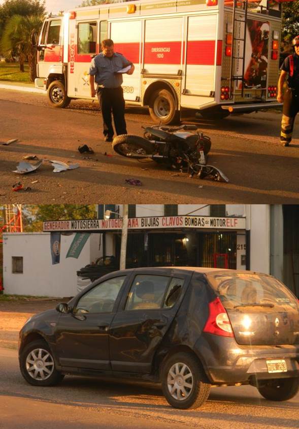 El violento choque ocurrió en Avda. Tomas Mazanti al 250, donde un motociclista a bordo de una Gerrero Trip Tunnig, impacta ferozmente contra un automóvil Renault Sandero guiado por una mujer de nombre Ana María Ávila, que transitaba de este a oeste. La motocicleta quedo destruida casi por completa, en tanto el vehículo mayor termino con abolladuras en la puerta trasera izquierda, y la rotura de una ventanilla donde incrusto la cabeza el joven conductor, que ademas recibio fractura en una pierna, fue identificado como Bryan Montenegro. Fue trasladado rápidamente al Hospital Regional. IMÁGENES
