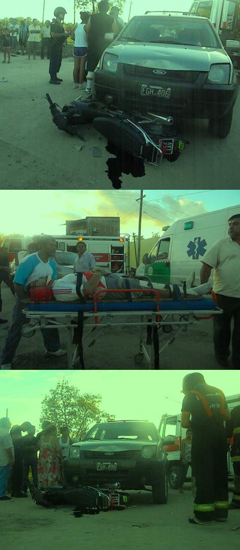 Los siniestros viales en Goya, siguen a la orden del día esta vez se registró uno en la tarde del feriado del 2 de Abril, en la intersección de Calle 9 de Julio y Bicentenario, donde una camioneta Eco Sport que conducida por un joven de apellido Chaves impacta a una motocicleta Honda Wave, en la cual conducía un hombre de apellido Enriques quien debió ser asistido por una dotación de bomberos debido a la lesión que recibió al salir despedido en el choque, luego fue trasladado en ambulancia al Hospital Regional para ser asistido.