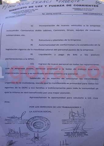 La reunión llevada a cabo en el mediodía del miércoles en la sede ubicada en Avda. Sarmiento y 12 de Octubre ante la presencia del secretario general de la Comisión directiva de luz y fuerza Montiel, el secretario gremial Antenor Martínez, el jefe de distribución DPEC Nino Ayalay obreros quienes firmaron un petitorio pidiendo que se solucione urgente la situación laboral de los obreros y además la destitución del jefe de la unidad operativa Goya Adrián González, ya que alegan que hace 7 años se encuentra al frente y no hay avance, solo brinda amenazas, aprietes, acosos laborales que solo lleva al malestar de los trabajadores. : :