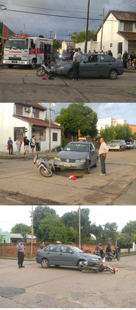 Dos jóvenes que iban a bordo de una motocicleta Honda Wave 110 c.c, que circulaban por calle 9 de Julio impactan contra un automóvil Volkswagen que transitaba por calle Alvear. En el impacto los jóvenes salen despedidos y caen sobre la vereda a metros del automóvil, recibiendo lesiones varias, y uno de ellos un fuerte golpe en una pierna. Fueron asistidos por una dotación de bomberos y luego trasladados en ambulancia al Hospital Regional Camilo Muniagurria, para ser asistidos. En el lugar se constituyo personal de la comisaria primera y peritos de la Unidad Regional Segunda.