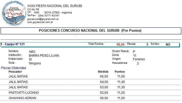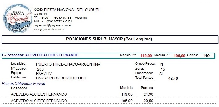 Como lo anticipo TNGOYA los resultados parciales, no fueron variados al cierre a las 12:50 hs, y se anunció oficialmente los ganadores del SURUBI 2014. Por pieza mayor Acevedo Alcides Fernando, de Puerto Tirol Chaco, en tanto la Barra pesquera de Lujan gano el concurso por puntos. Planilla de datos
