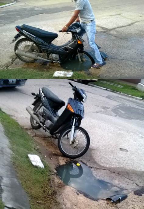 En la tarde del miércoles un joven motociclista cayó dentro de un gran bache que dejo la Empresa Aguas de Corrientes, ubicado en 9 de Julio y Avda. Madariaga, el conductor se hundió hasta la altura de la cintura. El rodado quedo destruido la parte delantera, ya que también termino dentro del gran cráter, que tiene más de un metro de profundidad. “La saque barata porque pudo ser peor” relato a cronista de TNGOYA Francisco Huipi. (Imágenes)