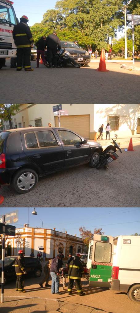 Pasadas las 16 hs del miércoles se registró un siniestro vual, en la intersección de Alvear y Bartolomé Mitre, donde por circunstancia que se trata de establecer un motociclista identificado como Lisandro Gamboni, resultó con lesiones al impactar con un automóvil Renault Clio. Fue asistido por bomberos y luego derivado al Hospital regional, IMÁGENES