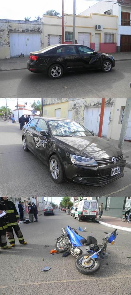 El siniestro vial ocurrio pasadas las 11 hs en la mañana del lunes, donde por razones que se tratan de establecer, un automovil Volkswagen Vento conducido por Rodrigo Lopez Lecube que circulaba por calle Entre Rios, fue impactado de lleno por una motocicleta 110 c.c, marca Gerrero conducido por Jose Arce, quien milagrosamente resulto ileso al ser despedido en la colision y caer al pavimeto, en tanto su rodado quedo destruido casi por completo. IMÁGENES
