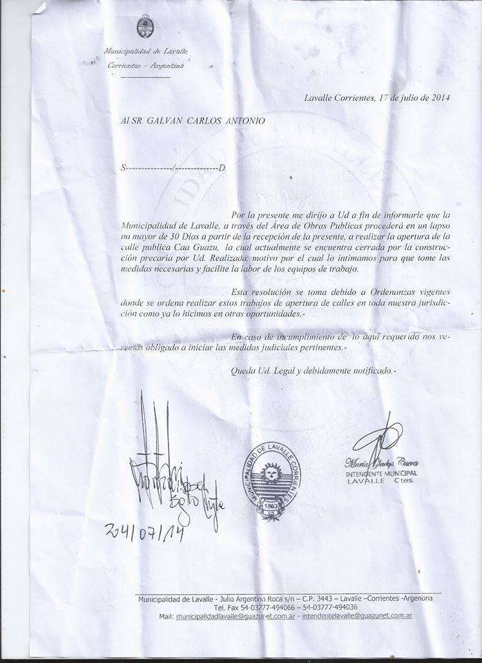 La nota fue enviada a redacción por el locutor Ricardo Chamorro de dicha localidad donde cuenta que la Intendenta del municipio la señora Gladys Cuevas del radicalismo envió una intimación POR MEDIO DE LA POLICÍA a un hombre que está en derecho de posesión por estar allí durante más de 28 AÑOS y dejarlo en la calle. La nota es clara y contundente donde la intendenta pide al vecino derribar su construcción y retirarse del lugar.