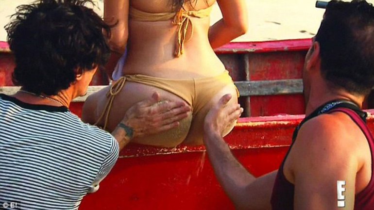 Los dos asistentes hombres de Kim fueron los encargados de ponerle arena en la cola para disimular posibles defectos tanto en la producción de fotos como en la grabación de su reality.