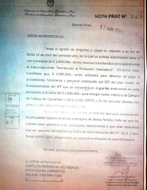 Mediante fax enviado al ministerio de agrigultura de la nación el interventor del IPT solicito ocupar dicho recurso que fuera habilitado a hacerlo, pero con la urgente devolución al momento de ser aprobados los POAS de administración del IPT 2014 y obra social ASPRO 2014. Lo que los productores dicen es que ese dinero aun no fue devuelto por la Camara del Tabaco ni por el IPT. Lo cierto es que hoy los pequeños productores de Goya que no superan ya los 1600 donde el 80% de ellos no llega a la producción ni siquiera de 2.000 kilos al año y por falta de pago reclaman el cobro inmediato de los meses adeudados del pago de sobre precio y además la cancelación de la deuda de lo acopiado. La diputada Ferreyra se comprometió de su parte a realizar las investigaciones del caso y constatar el uso del recurso de los productores. Los productores además hicieron notar una mala relación con la cámara del tabaco, donde cada vez que hay una reunión los esperan con un móvil policial y nos los dejan pasar. Pereira por su parte invito a los productores a reunirse con los demás ediles para avanzar en reclamos conjuntos de ser posible. FAX ENVIADO A NACION PARA SOLICITAR EL USO DE RECURSOS DE PRODUCTORES