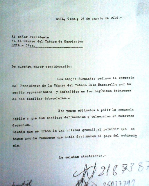Productores tabacaleros de Goya piden por escrito la renuncia del presidente de la cámara del tabaco Luis Saccarello por no defender ni representar a la familia de los productores tabacaleros. También piden la renuncia por sentirse defraudados y vulnerados en los derechos de los productores ya que la entidad gremial hace uso de recursos que están destinados al pago del sobre precio.