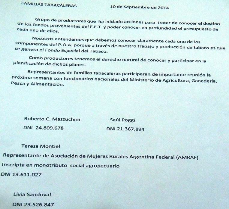 Grupo de productores tabacaleros han iniciado acciones para tratar de conocer el destino de los fondos proveniente del FET y poder conocer en profundidad el presupuesto de cada uno de ellos. A continuación el comunicado.