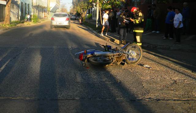 Un hombre de apellido Ibarrola que circulaba a bordo de una motocicleta Honda Wave, impacta a un automóvil marca Chevrolet Onix que era conducido por un hombre de apellido Stalla, y estrella la cabeza contra la ventanilla de la puerta del acompañante, el impacto fue de tal magnitud que recibió heridas cortantes y serios golpes a raíz de no tener puesto el casco. Fue asistido por Bomberos y trasladado al Hospital Regional. El siniestro ocurrió en las calles San Martin y Evaristo López. (IMAGENES)