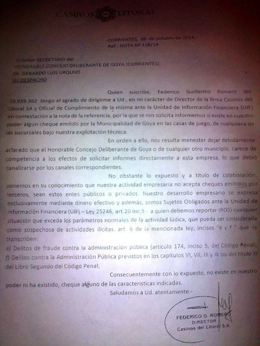 Así, Casinos del Litoral respondió a un pedido de informes realizado por el Concejo Deliberante para esclarecer algunas acusaciones que se dirigieron al secretario de Gobierno, Marcos Bassi. La empresa aclaró que no aceptan cheques de ninguna naturaleza, tanto públicos como privados. Así se desmintieron tajantemente las versiones calumniosas que se dirigieron al secretario de Gobierno. Quiroz dijo que será el intendente Gerardo Bassi, y el Secretario de Gobierno Marcos Bassi quienes determinen si se iniciarán acciones judiciales en contra de las personas que en su opinión difundieron estas versiones para desprestigiar, y “ensuciar” la imagen del gobierno municipal.