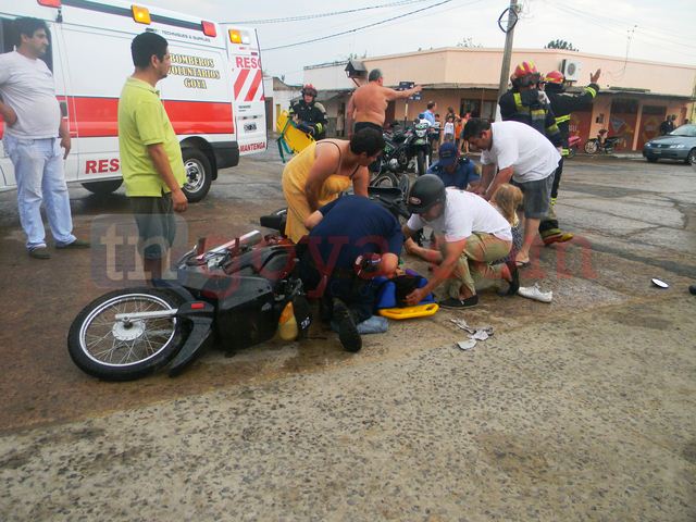 En pleno chaparrón dos motocicletas marca Guerrero Trip impactaron en Avenida Sarmiento y Tucumán, en los rodados iban una anciana de nombre Lourdes Medina de Fernandez, un joven de apellido Segovia y un menor de 8 años, resultando todos con severas lesiones al caer pesadamente en el pavimento. Primeramente fueron asistidos por Bomberos y luego trasladados en ambulancia al nosocomio local. IMAGENES