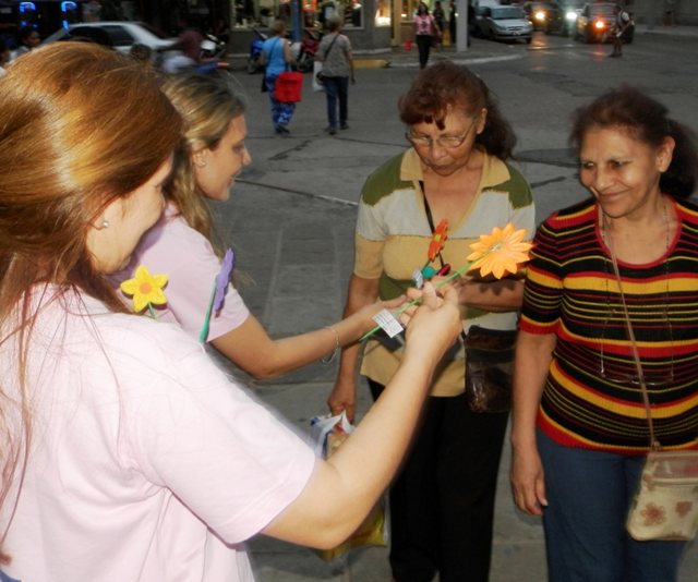 El equipo de la dirección de inclusión junto al concejal Ariel Pereira repartieron 1000 flores y lazos rosados cuyo significado y color tan femenino es ideal para representar la lucha contra el Cáncer de Seno vinculado a la vida y a la lucha de miles de mujeres que en el mundo buscan sobrevivir al cáncer de mama, rosa asociado al activismo de aquellas mujeres que desean crear conciencia sobre la importancia de la detección temprana de la enfermedad. Rosa, es el color que tradicionalmente ha sido asociado a la mujer. El color rosado identifica a las mujeres desde antes de nacer. Cuando sabemos que el bebé será una niña, la ropa, las paredes del cuarto, sus accesorios, juguetes y todo lo que servirá para su cuidado es de color rosado. Es indudable que este es el color que representa a las mujeres a nivel mundial. El objetivo principal del lazo rosado es concienciar sobre el cáncer de mama para: La prevención de la enfermedad, La detección temprana, La cura y los cuidados necesarios. FORMAS DE PREVENIR EL CÁNCER DE MAMA Evitar rayos X si no es realmente necesario: Los Médicos suelen mandarte a hacer rayos X, incluyendo mamografías, algo que puede salvarte la vida. Sin embargo, los rayos X exponen a las mujeres a la radiación y la radiación en exceso puede causar mutaciones en el ADN que conducen al cáncer de mama. Así que antes de someterse a una radiografía, siempre pregunte a su médico si es realmente necesario. No espere a tener hijos: Las mujeres que tienen un hijo antes de los 35 años tienen menos probabilidades de desarrollar cáncer de mama. Obviamente, no siempre es posible planificar con exactitud cuándo va a tener un hijo. Pero si usted está tratando de elegir entre tener hijos temprano o se centra en su carrera, "un consejo: los niños primero". Haga ejercicio: Ya no hay ninguna duda el ejercicio ayuda a prevenir el cáncer de mama. Y los pacientes de cáncer de mama que hacen ejercicio tienen menos probabilidades de sufrir una recurrencia. Controle su peso: El exceso de peso nunca es una buena cosa, pero las mujeres que ponen en la libra después de la menopausia son más propensas a desarrollar cáncer de mama. Piénselo bien antes de usar hormonas: Los suplementos de hormona pueden ayudar a aliviar los síntomas de la menopausia, pero estudio tras estudio ha demostrado que el estrógeno más progestina aumenta el riesgo de cáncer de mama (por no hablar de un ataque cardíaco y accidente cerebro vascular). Limite el consumo de alcohol: Beber alcohol de manera ocasional no es probable que cause problemas. Sin embargo, más de tres o cuatro bebidas alcohólicas a la semana parece aumentar el riesgo de cáncer de mama. Y las bebidas deben ser espaciadas. Amamantar a su bebe el mayor tiempo posible: La lactancia materna parece proteger contra el cáncer de mama. No renuncie a las mamografías: Está claro que las mamografías pueden salvar vidas mediante la detección de tumores tempranos - al menos para las mujeres de 50 años o más. Más joven que eso? La mejor manera es discutir los pros y los contras con su médico. Limitar el consumo de carnes rojas: Si bien no parece haber tal cosa como una "dieta preventiva" del cáncer de mama, dice el Dr. Amor atiborrarse de grasa animal es probablemente malo. Es mejor comer una dieta baja en grasas animales y rica en granos enteros, frutas y verduras. Conozca sus senos – Auto examen: Si no presta atención a sus pechos, puede perder la oportunidad de descubrir bultos u otros síntomas que sugieren un problema. Hágase un auto examen porque es la mejor manera de mantener un ojo sobre ellos - y hable con su médico si nota cualquier cambio sospechoso.