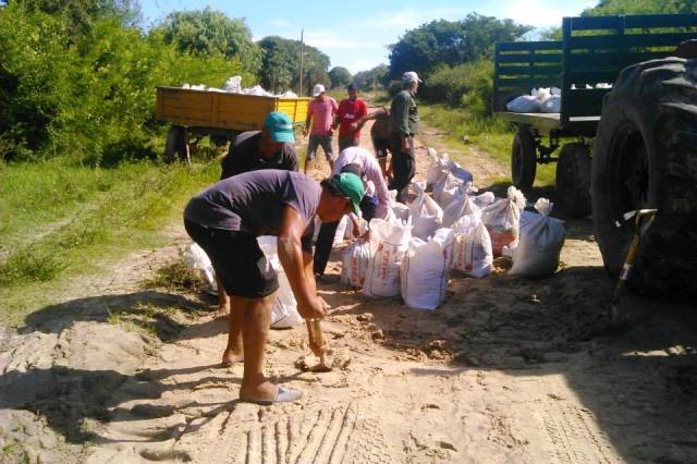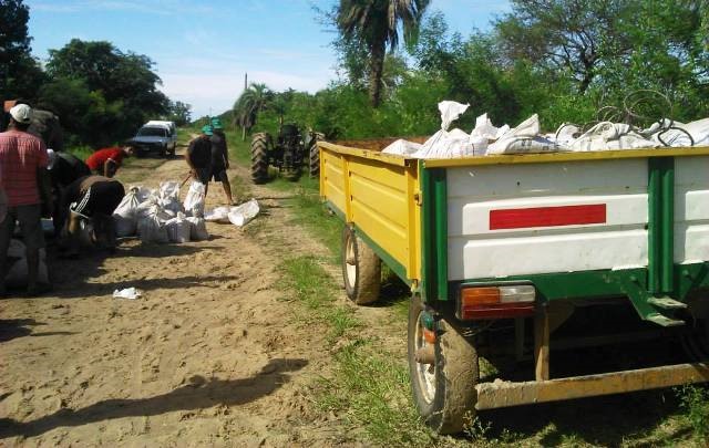 Así como se observan en las imágenes pese a las condiciones adversas, ellos tiran para adelante todos juntos. De esta manera, da gusto trabajar. En el día de hoy se realizo un arduo trabajo llevando bolsas de arena para rellenar el camino de La 14 hasta llegar al Bañado. Vecinos a colaborar como así también el tractor y el acoplado de la estancia La Rosario pusieron su granito de arena.