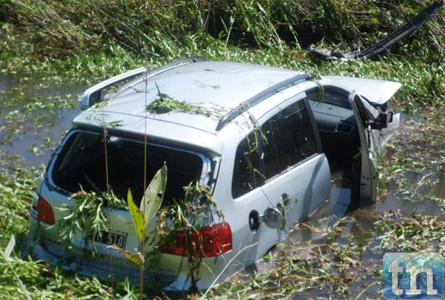 Cerca de las 10,30 horas de la mañana del lunes un hombre de apellido FIRKA quien conducía un VW Suran de color gris dominio LYH 514 tras perder el control del rodado, derrapo por más de 30 metros, dio varios tumbos según testigos oculares y termino en medio del canal abierto. Afortunadamente venia solo y salió por sus propios medios hasta quedar junto a la banquina. (IMÁGENES)