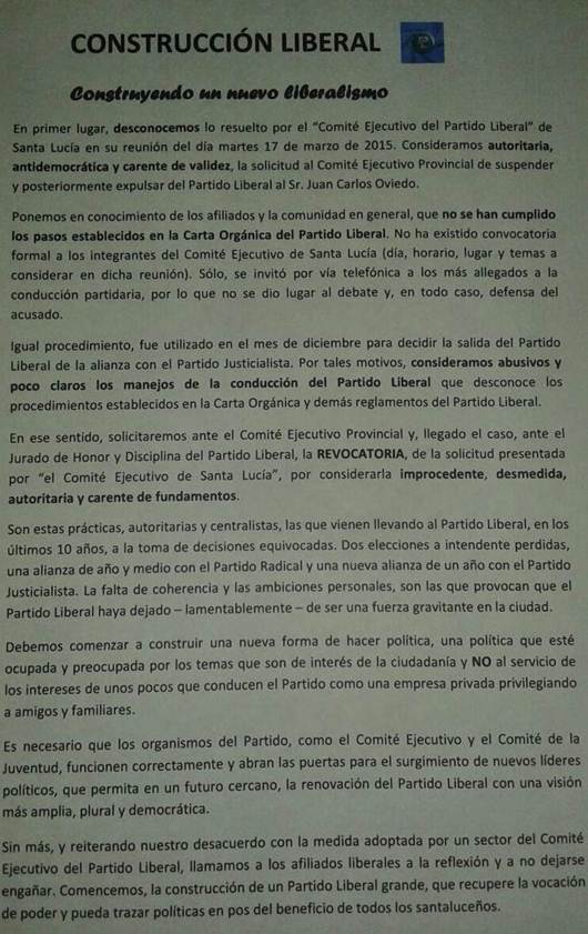 Desde “Construcción liberal” de Santa Lucía emitieron un comunicado por considerar que fue incorrecta la decisión que habría adoptado el comité ejecutivo del PL de esa localidad para expulsar a uno de sus integrantes. “En primer lugar, desconocemos lo resuelto por el “Comité Ejecutivo del Partido Liberal” de Santa Lucía en su reunión del martes 17 de marzo de 2015. Consideramos autoritaria, antidemocrática y carente de validez, la solicitud al Comité Ejecutivo Provincial de suspender y posteriormente expulsar del Partido Liberal a Juan Carlos Oviedo”, comienza diciendo el escrito.