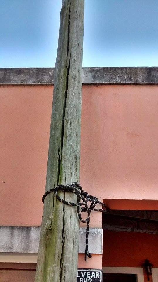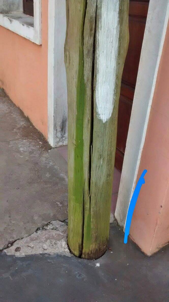 Vecinos de calle Alvear al 800, molestos porque un poste del tendido eléctrico esta partido al medio e inclinado y a punto de caer, uno de ellos lo amarro con una soga a la pared, pero esto no es al solución, manifestaron a cronistas. Realizaron varios reclamos, pero la solución jamás llega. IMAGENES