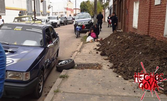 Según se pudo saber el automovilista salía de un taller de gomeria y transitaba por la calle San Martin cuando de repente siente un desnivel en su vehículo y procede a frenar, para su sorpresa encuentra tirada a un peatón sobre la vereda con la rueda del automóvil que se había desprendido. Si bien Ferreyra, la peatón que fuera golpeado con la rueda del rodado estaba consciente, esta manifestaba fuertes dolores en la región lumbar. De inmediato se comisiono un móvil policial, bomberos, personal de transito, ambulancia y peritos de la URII.