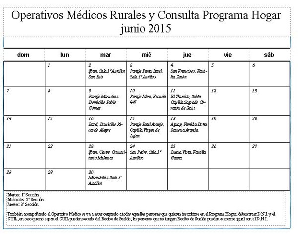 La Subsecretaría de Desarrollo Humano y Promoción Social de la Municipalidad de Goya, informó las fechas de los operativos médicos rurales que se llevarán a cabo durante el mes de junio de 2015, remarcando que los martes se atenderá en la 1ª Sección, los miércoles en la 2ª Sección y los jueves en la 3ª Sección Rural.
