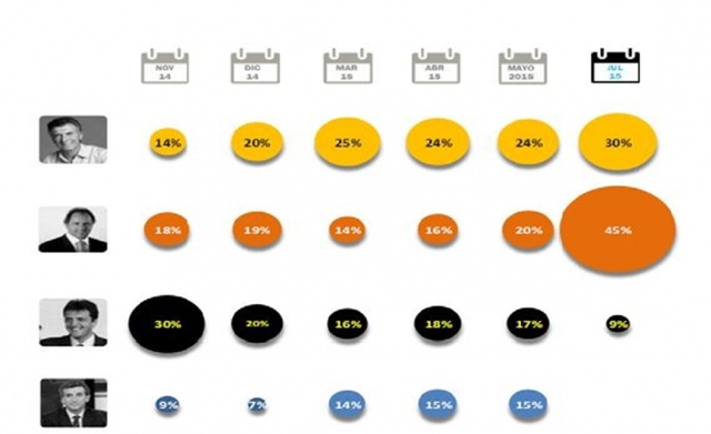 En este sentido, entre el período noviembre 2014 y julio de 2015, Massa pasó de ser el líder en las encuestas, con más de diez puntos de ventaja sobre Scioli y Macri a quedar en un tercer puesto relegado: en ocho meses perdió más de 20 puntos.