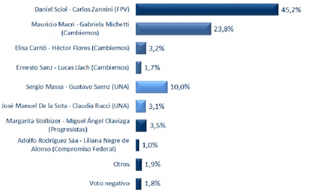 En el territorio bonaerense, también se desprende de la encuesta que el voto en favor de Florencio Randazzo se unificó en Daniel Scioli casi sin excepciones luego de su desistida en la carrera presidencial, representando así un 15 por ciento de aumento en la intención de voto que se sumó a la figura del gobernador entre mayo y julio de este año.