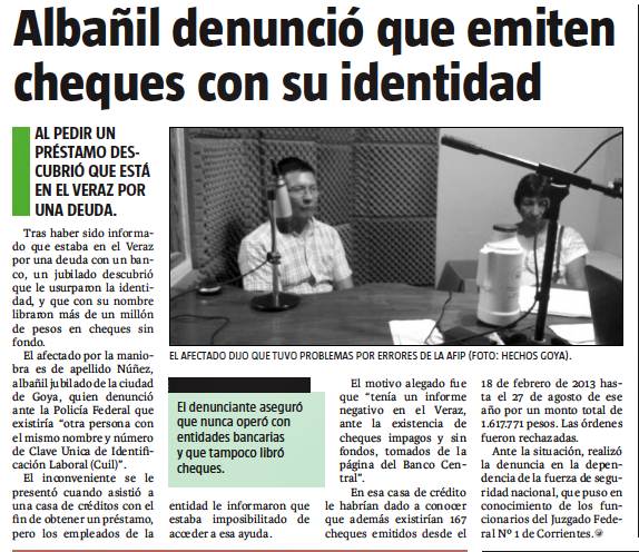 El caso del goyano Juan Carlos Núñez, que denuncio el uso de su identidad por otra persona y así emitir cheques sin fondos, repercutió en medios provinciales, uno de ellos es DIARIO NORTE, quien reflejo la noticia que se publicó en TNGOYA.COM el día miércoles.