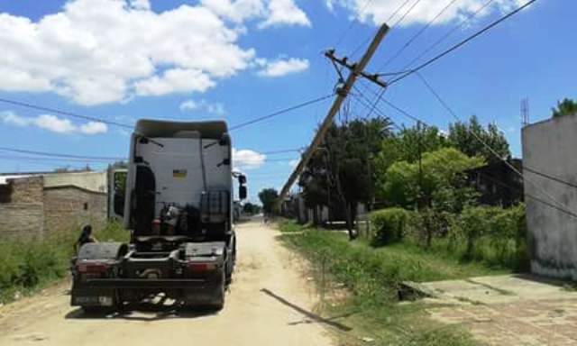 Otra vez es uno quien paga los platos rotos, vecinos del B° San Ramón y Sarmiento quedaron sin luz debido a que un camión que se aprecia en las imágenes se llevo puesto línea de red de la Dpec y por tal motivo tiro abajo un poste y metros de cable del tendido eléctrico dejando sin suministro a un centenar de vecinos en ambos barrios. El hecho ocurrió en calles Maestro Argentino y Brasil en horas del medio dia.