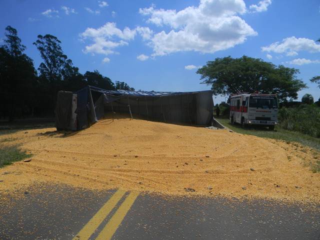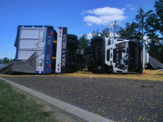El camión que transportaba maíz quedó atravesado sobre Ruta Nacional 12, el Renault Fluence fue a parar en la banquina, donde los restos del conductor quedo entre los metales retorcidos.