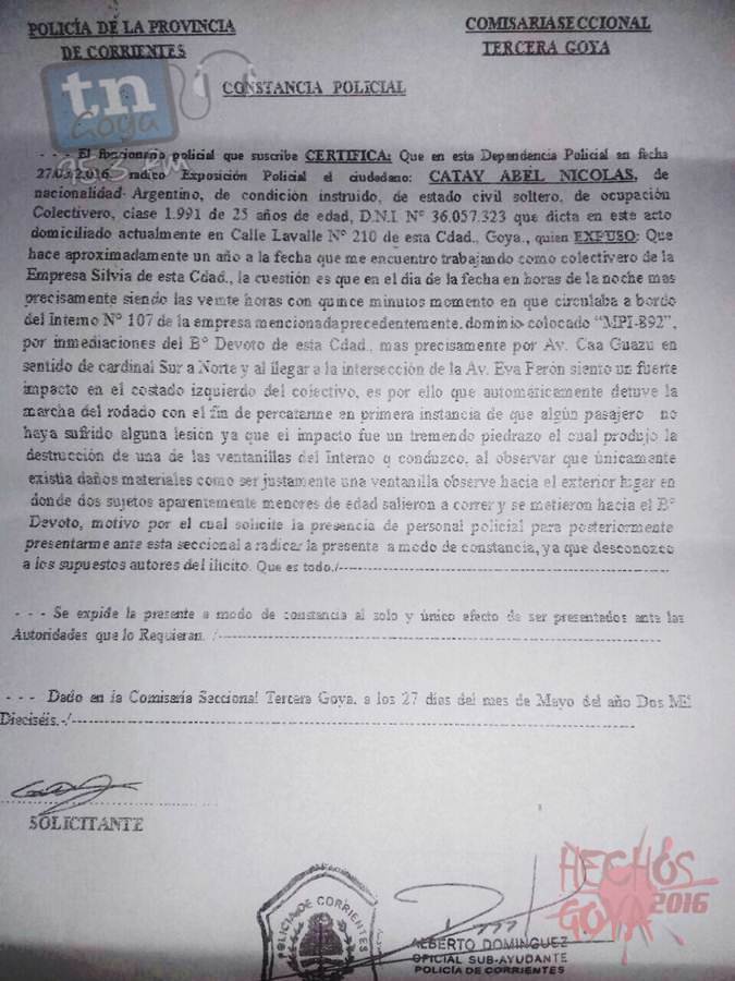 El empresario Osvaldo Spessot salió al cruce de los dichos que se dio en la reunión llevada a cabo en las oficinas de la URII de la Policía de Corrientes, Comisario General Héctor Montiel, y el Jefe de la Cria Tercera con jurisdicción en zona sur de la ciudad, Crio Inspector Marcelo Aquino, este último expreso que no se registró ninguna denuncia, pero Spessot hizo llegar la copia de la misma realizada el 27/05/2016. La afirmación que no tenía conocimiento fue ante Comisión de Transporte de la municipalidad, y no cayó bien al empresario, quien se mostró muy molesto, ya que un oficial ayudante recibió al chofer de la unidad atacada con piedras y realizo la constancia policial.