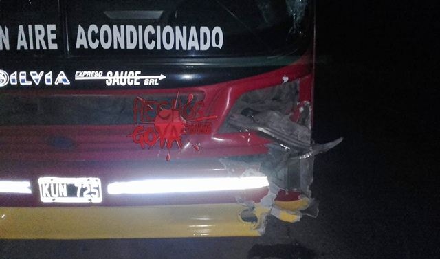 En trágico hecho ocurrió aproximadamente 22:30 hs en zona este de Goya, la motocicleta guiada por Nicolás Encinas, iba de acompañante su cuñada Elizabeth Medina y una menor, quienes salían del camino hacia Ruta 27 y protagoniza el siniestro vial con un micro de Empresa Silvia interno 120, conducido por Maximiliano Coldani, que provenía de la localidad de Santa Lucia, el chofer se encuentra detenido en la comisaria segunda, con el vehículo que manejaba.