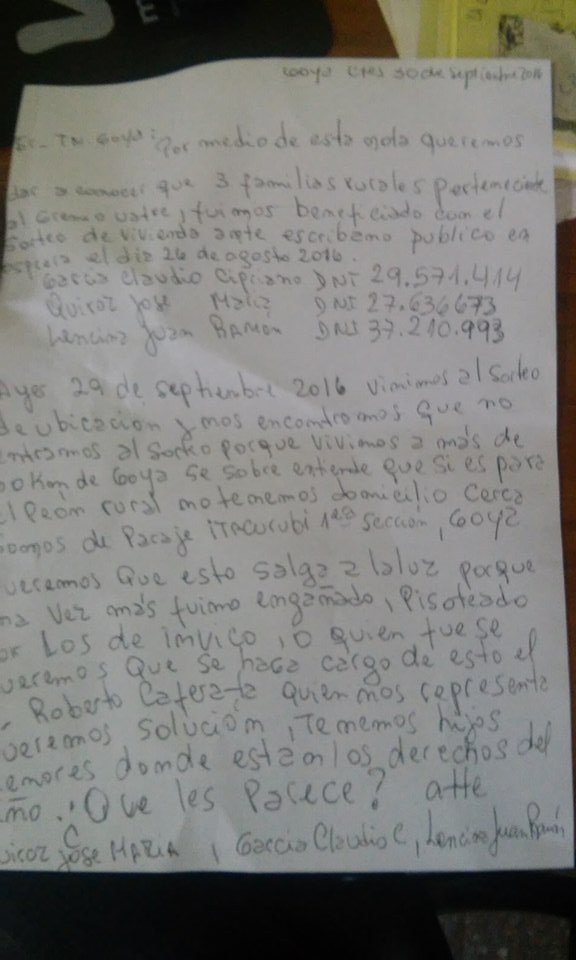 Nota a TN Goya: Por medio de esta nota queremos dar a conocer que 3 familias rurales perteneciente al gremio de UATRE, fuimos beneficiados con el sorteo de vivienda ante escribano público en OSPRERA el día 26 de agosto de 2016. García, Claudio Cipriano Quiroz, José Maria Lencina, Juan Ramón Ayer 29 de septiembre 2016 vinimos al sorteo de ubicación y nos encontramos que no entramos en sorteo porque vivimos a más de 30km de Goya se sobre entiende que si es para peón rural no tenemos domicilio cerca somos del Paraje Itacurubi 1ª Sección Goya. Queremos que esto salga a la luz porque una vez más fuimos engañados y pisoteados por los de INVICO, o quien fuese queremos que se haga cargo de esto el señor Roberto Cafferata quien nos representa. Queremos solución, tenemos hijos menores, donde están los derechos del niño.