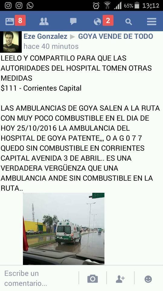 Una ambulancia del Hospital Regional de Goya, se quedó varada en la avenida 3 de Abril en la capital correntina, el motivo habría sido la falta de combustible. La noticia corrió por las redes sociales con la foto de la unidad quedada, un chofer de ambulancia de una empresa privada de la Cruz, tomo imágenes e hizo viralizar, al cual una cuenta de Facebook, de nombre Choferes ambulancias Corrientes, también publicaron repudiando lo ocurrido. “Las ambulancias de Goya salen a la Ruta con muy poco combustible en el día de hoy 25/10/2016 la ambulancia del hospital de Goya patente, OAG 077 quedo sin combustible”; es parte de la publicación. TNGOYA, pudo saber que trasladaba a un joven que se accidento el pasado sábado.
