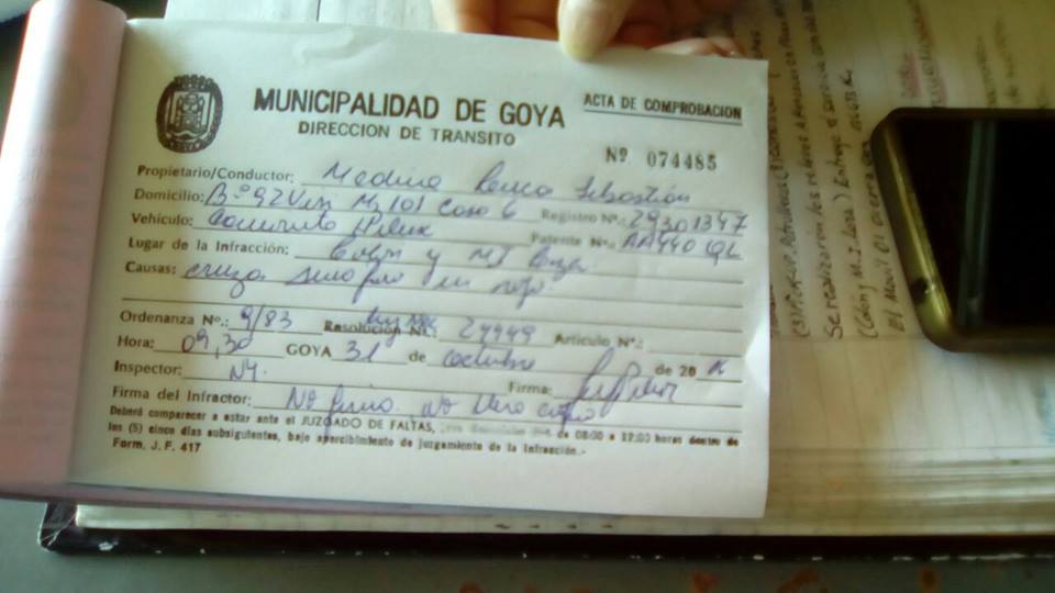 En horas de la mañana un comerciante de nombre Medina Sebastián que conducía una Hilux 0KM, paso en rojo un semáforo ubicado en Colon y Mariano I. Loza, cuando una inspectora de apellido Novello lo multo. Sin mediar palabra, Medina le pego una trompada a la misma noqueándola en el instante. En este momento le realizan una tomografía computada a Novello en el hospital Camilo Muniagurria. El conductor es reincidente y fue detenido por personal policial de la comisaría quinta de nuestra ciudad. EN LA NOTA EL ACTA DE INFRACCIÓN.
