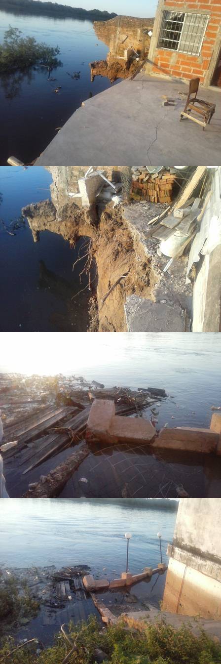 En la tarde del lunes, promediando las 17 hs, se conoció la noticia que viviendas ubicadas en la costa norte, en Pataje Remanso, algunas sufrió el desmoronamiento del fondo y otras están en peligro, porque el socavamiento sigue, en el lugar personal de Defensa Civil, trabajo arduamente y hay familias que se estaban mudando. Los relatos de vecinos que recabo nuestro cronista en el lugar fue que unos 40 metros de ancho por 10 de fondo fue lo que se devoró el agua.