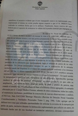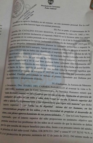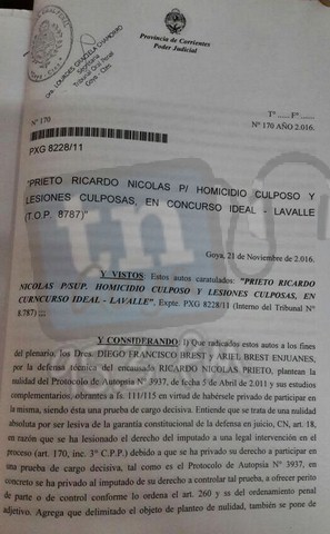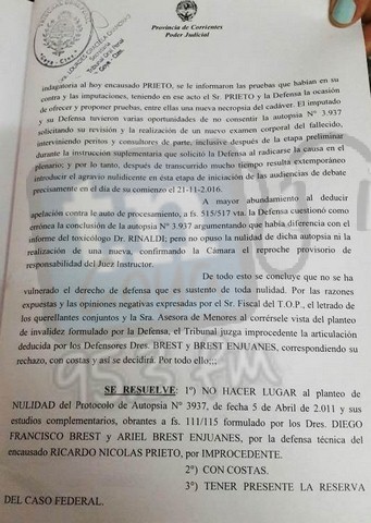 Luego de 4hs de debate por el caso de Nicolás Arévalo se decidió pasar a un cuarto intermedio hasta las 16 hs donde siguio las declaraciones de los testigos en la causa. Durante la mañana declaro Gladis Arevalo (mama del Nico),Aníbal Oscar Arévalo, hermano de Santiago; y Miguel Ángel Escobar, concubino de la madre de Celeste Estevez, la niña que recibió serios daños a su salud por el envenenamiento. A continuación copia de la desestimación de los jueces del TOP, ante el pedido de la nulidad de la autopsia por parte de la defensa del acusado PRIETO RICARDO NICOLAS.