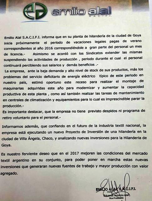Emilio Mal S.A.C.I.F.I. informa que en su planta de hilandería de la ciudad de Goya inicia próximamente el periodo de vacaciones legales pagas de verano correspondientes al año 2016 correspondiéndole a gran parte del personal un mes de licencia. Asimismo se acordó con los Sindicatos extender las mismas suspendiendo las actividades de producción, periodo durante el cual el personal continuará percibiendo sus salarios y demás beneficios.