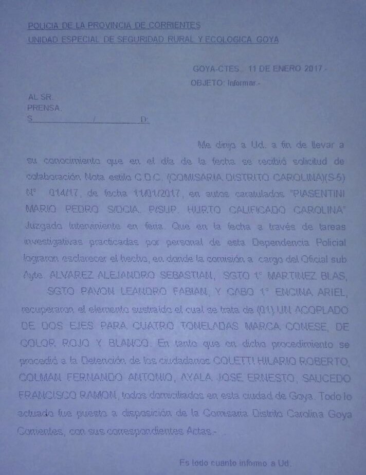 Personal policial del Priar Goya, recupero en la tarde del miércoles un acoplado con dos ejes que fuera robado el día martes en la jurisdicción de Carolina en horas del mediodía a un vecino de apellido Piasentini que posee su vivienda al costado de la ruta Nacional N° 12. Tras la denuncia pertinente y la circular que enviaron diferentes dependencias policiales, se realizó un trabajo de inteligencia y arrojo positivo el procedimiento por parte de dicha comisaria. Hay dos detenidos por el hecho un goyano de apellido Collman un Rosarino de apellido Ayala, que vive en nuestra ciudad y otro de apellido Coletti, que tras declarar fue puesto en libertad.