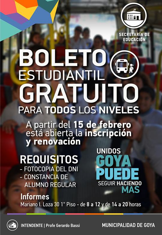 La Secretaria de Educación de la municipalidad de Goya informa que a partir del 15 de febrero estará abierta la inscripción y renovación del boleto estudiantil gratuito para todos los niveles. los mismos deben acercarse a Mariano I. Loza 30 1º Piso de 8 a 12 y de 14 a 20 horas.