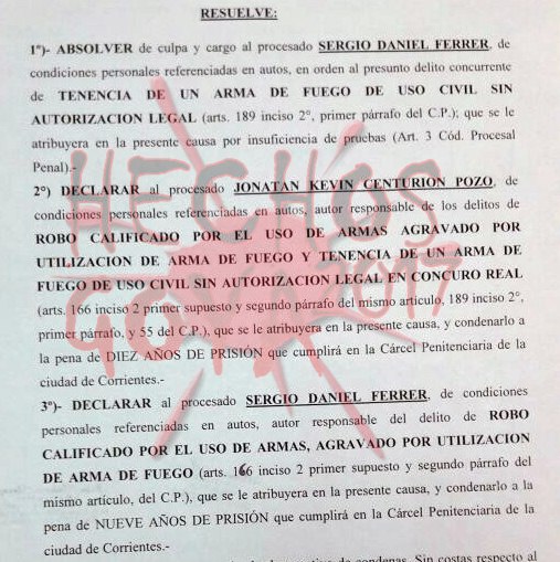 En la mañana de este martes el Tribunal Oral Penal llevo adelante el debate de Centurión Pozo Jonatán Kevin y Ferrer Sergio Daniel / Robo Calificado (CON ARMA) Agravado (UTILIZACION DE ARMA DE FUEGO) y Tenencia de Arma de Fuego de Uso Civil en Concurso Real. CAROLINA / 16 a los que hallaron culpables de los cargos por el violento robo que sufrió la familia Zoilo y a cada uno le correspondió la pena de 10 años de prisión efectiva para Centurión Pozo y 9 años a Ferrer Sergio a cumplir en la Penitenciaria de Corrientes.
