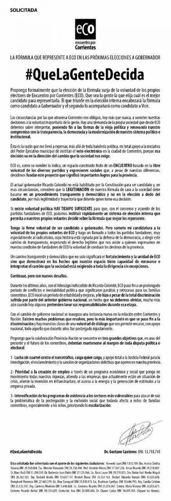 Mediante una solicitada en dos matutinos locales de la Ciudad, el Vicegobernador Gustavo Canteros pidió que se dé inicio al proceso interno dentro de Encuentro por Corrientes. “Que la gente decida”, es el título de la publicación en el que insiste que Colombi llame a elecciones internas para elegir al candidato a Gobernador por la alianza.